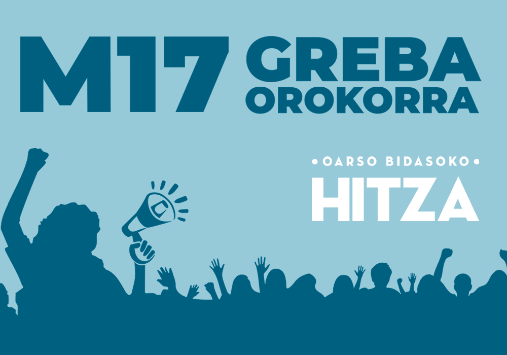 OARSO BIDASOKO HITZAko langileak, baina, greba orokorrarekin bat eginagatik ere, M17an lanean arituko gara, greba aktiboa egin eta grebari oihartzuna emateko.