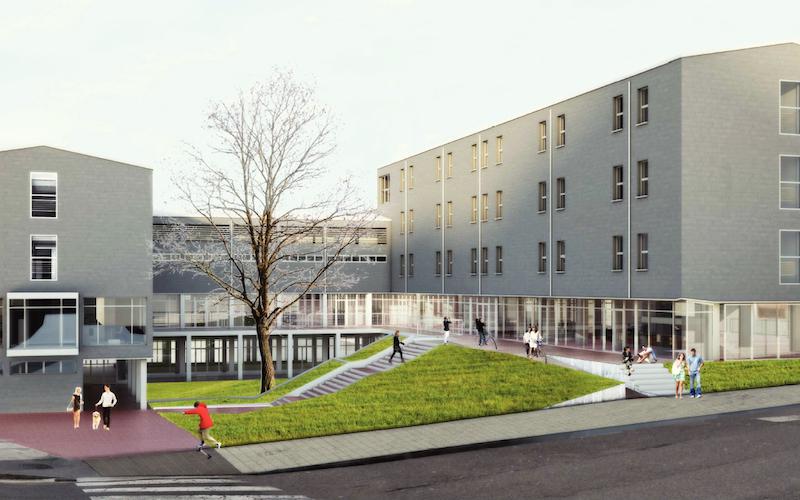 Eraikinaren etorkizuneko itxuraren muntaia.