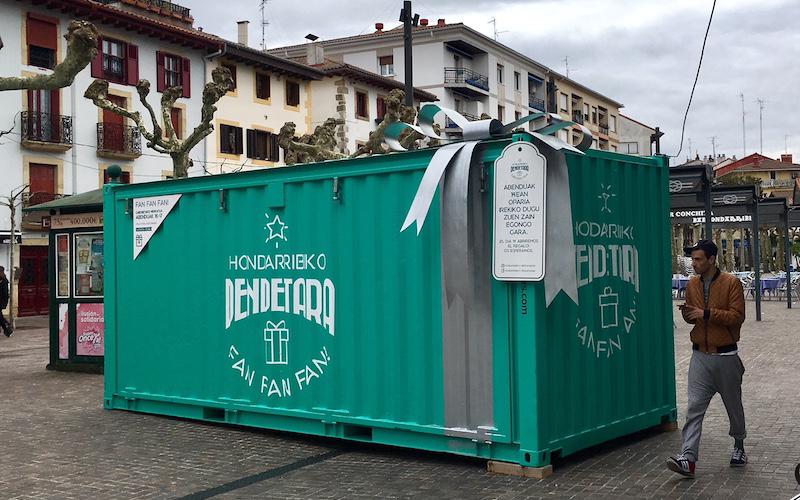 Hondarribiko dendetara fan fan fan! merkataritza sustatzeko kanpainaren barruan antolatu dute merkatua. San Pedro kalean itsas edukiontzi bat jarri dute kanpainaren informazio gune bezala. Bertan, kanpainarekin bat egin duten merkatarien fitxak, eta urte amaierako erosketak egiteko hainbat proposamen.