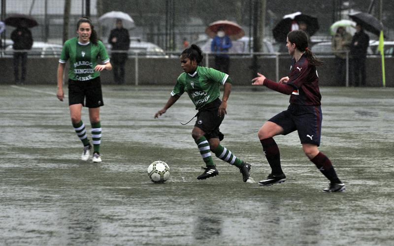 Porrot batekin hasi du Hondarribia Futbol Elkarteak Euskal Ligarako igoera fasea. Eibarren kontra galdu zuten Ainhoa Iñarraren neskek (0-2), atzo arratsaldean Hondartzako belar artifizialeko zelaian jokatutako partidan. Euria izan zen protagonista, bota eta bota aritu baitzen partida hasieratik bukaeraraino, eta putzu handiak sortu ziren zelaian, baloiaren kontrola zailduz.
