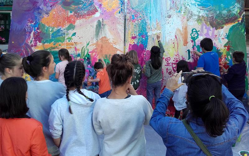 Haurrak, errefuxiatuen aldeko muralaren fondoak margotzen, iaz