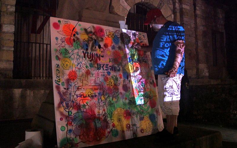 Arratsaldeko seietatik gauerdira arte irauten du hiru ekintzetako bakoitzak, eta koadroa sortzearen prozesu osoa erakustea du helburu: “Hasteko, koadroa muntatzen da, ondoren tela jarri, eta gero fondoak lantzen hasten gara”. Inguruan dauden pertsonek lagundu dezakete, bai fondoak sortzen, baita geroxeago ere, errotulagailuekin, testuekin, nahi dutenarekin. “Eta gero hasten naiz ni koadroa osatzen. Iluntzean, prozesu berria sortzen da, argiekin, proiekzioekin hasten naizelako”, azaldu du.
