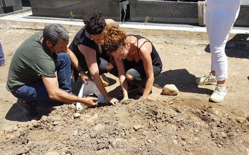 Carreraren ilobak Alcalako hilerrian osabaren hobiko lurra biltzen, Hondarribira eramateko