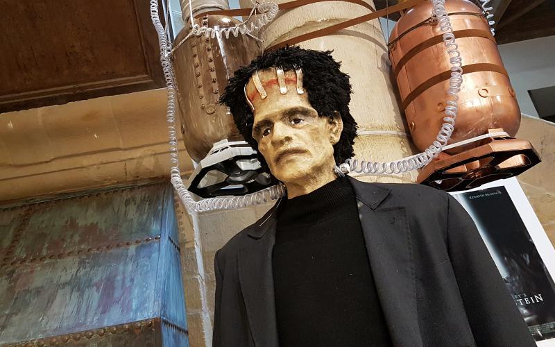 Idazlea jaio zen egunerako txokolatea prestatuko dute liburutegian. Baina, horren zain egon gabe, bere idazlan ezagunenean oinarritutako erakusketa muntatu dute Zuloaga Etxeko beheko solairuan. Frankenstein pertsonaian oinarritutako filmak, filma horietako kartelak, liburuak, komikiak… bildu dituzte erakusketarako. Beste inon ikusi ezin diren piezak ere erakusgai daude, hala nola, Judas Arrietak diseinatutako figurak, Menina txotxongilo-tailerreko Jonan Basterretxeak eta Idoia Seijok sortutako panpina (irudian), eta Elena Odriozola ilustratzailearen paperezko figurak eta antzokitxo bat, irudien bidezko narrazio aukera berriak zabaltzen dituen agertokia.