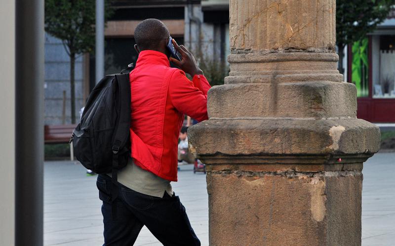 Migratzaile bat Irungo San Juan plazan telefonoz hitz egiten, Bidasoaren beste aldera joateko unearen zain