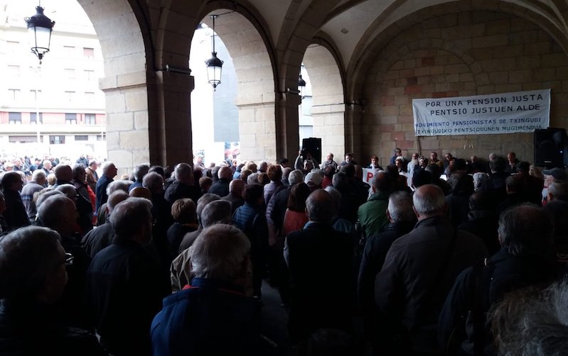 Txingudiko Pentsiodunen Mugimenduko kideak berriz ere kalera atera dira, hiria pentsio duinen aldeko oihuz betetzeko asmoz. Asteleheneroko elkarretaratzeei jarraipena eman diote gaur ehunka eta ehunka lagunek. Eguraldia dela eta, udaletxe azpiko arkupeetan elkartu behar izan dira.