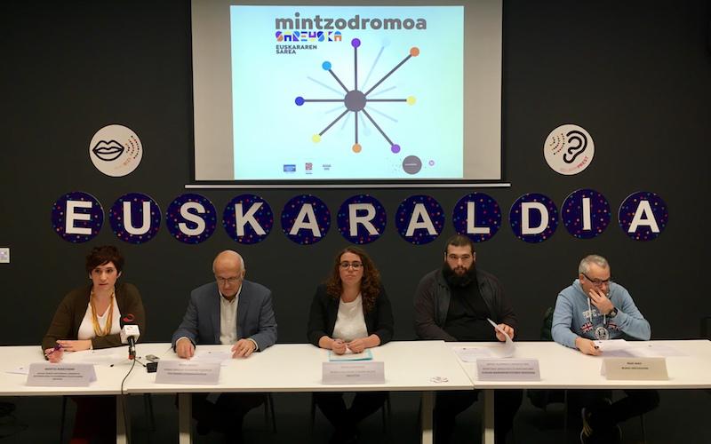 Aurtengo Mintzodromoaren aurkezpenaren irudia. Ezkerretik eskuinera, Arantxa Berrotaran (Bidasoa Txingudi partzuergoko zuzendaritza batzordeko kidea), Beñat Arrabit (Euskal Hirigune elkargoko Hizkuntza politikaren lehendakariordea), Monica Martinez (Irungo Udaleko euskara arloko ordezkaria), Ander Almandoz (Bortzirietako ordezkaria) eta Iñaki Abad (Irungo Mintzalaguna).