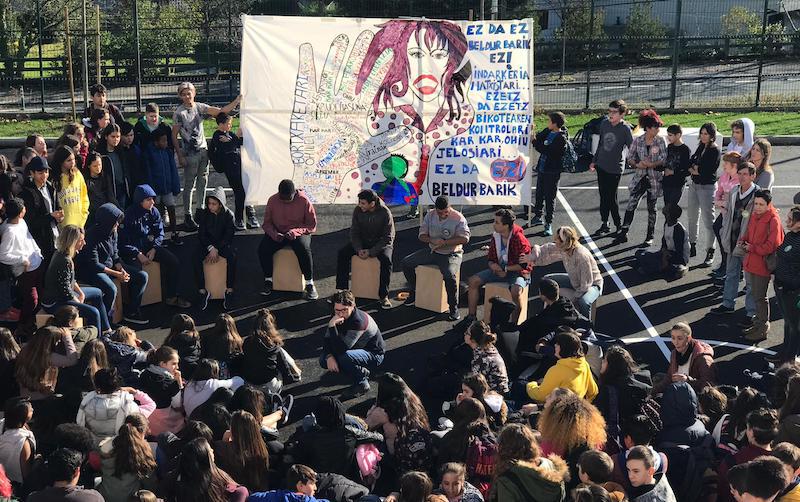 Goizean ikastetxe ezberdinek San Juan Plazan egin duten bezala, eguerdian Hirubide BHIko ikasle, irakasle eta administrazioko lankide guztiak ikastetxeko patioan bildu dira.