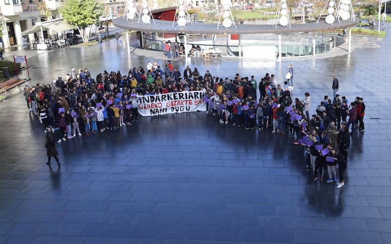 Gaur, Irungo San Juan plazan, hiriko zenbait ikastetxek elkarretaratze jendetsua egin dute. ‘Indarkeriarik gabeko gizarte bat nahi dugu’ lelopean ehunka ikasle, irakasle eta udaleko ordezkari bildu dira. Datorren igandeko (hilak 25) Emakumeenganako Indarkeriaren Kontrako Egunaren harira, indarkeria matxistaren aurkako oihuz bete nahi izan dute plaza gazteek.