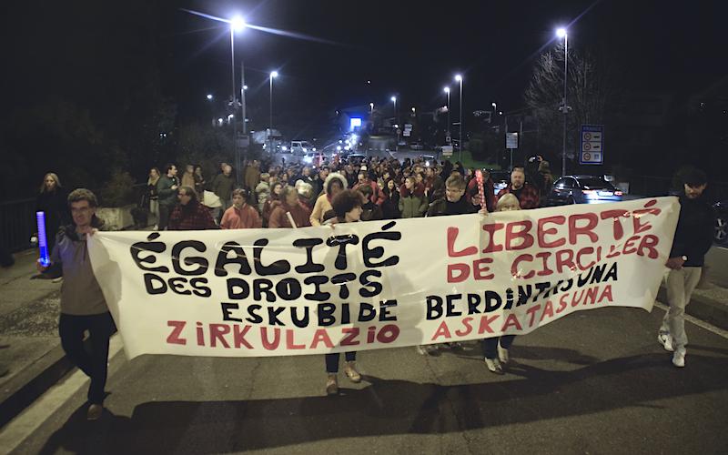 Errepidearen bi aldetan elkarretaratu ziren lehenik Hendaia eta eskualdeko herritarrak. Ondoren, bi norabideak moztu ostean, Ficobarako bidea hartu eta Hendaiako Erretenzio Zentrorako bideratu ziren, manifestazio moduan.