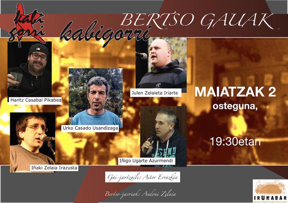 Haritz Casabal antxotarra, Urko Casado astigartarra, Julen Zelaieta beratarra, Iñaki Zelaia hernaniarra eta Iñigo Ugarte irundarra ariko dira bertsotan.
