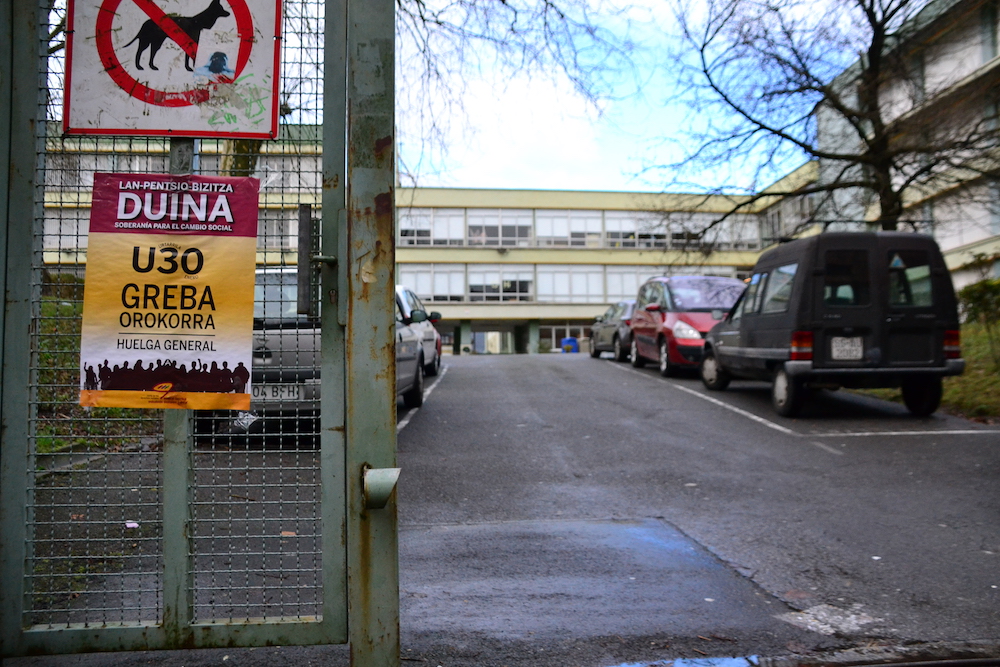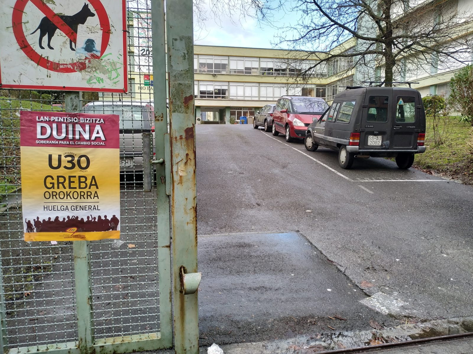 Irungo ikastetxe baten ataria, gaur. Hiri handia izanda, gaurko Euskal Herriko Eskubide Sozialen Kartak deituriko greba orokor deialdiaren eragina txikia izan da Irunen. Hiriko denda, komertzio eta tabernek, askok, ateak zabaldu dituzte goizetik. Industrialdeetan ere aktibitatea egin da; ez egunerokoa, grebaren eragina nabaritu delako, baina izan dira lanean egon direnak, batez ere enpresa txiki eta ertainak. Hezkuntza zentroetan handiagoa izan da greba deialdiak izan duen jarraipena, eta udalean, gehiengo izan da lanean izan direnen kopurua. Udalak ez du jarduera eten. Grebarekin bat egin duten irundarrek, ordea, ozen zabaldu dituzte euren aldarrikapenak piketeen bidez, edo auto karabanen bidez.