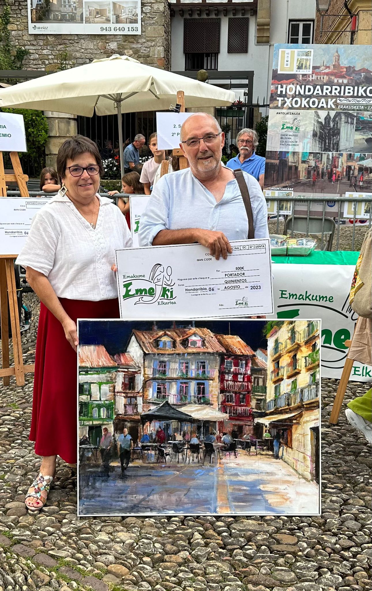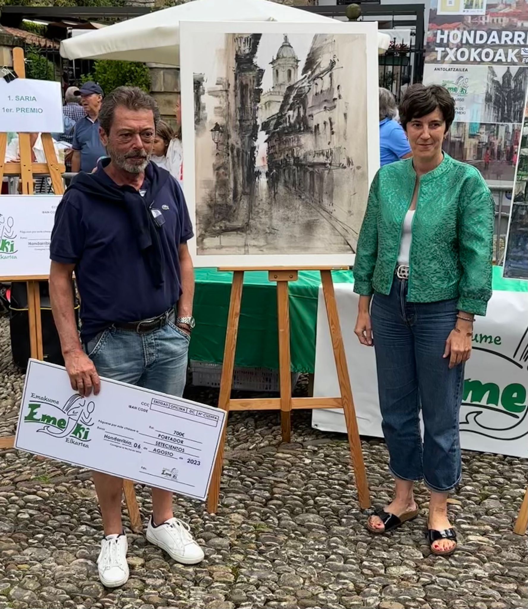 Federico Plasencia, lehen sariaren irabazlea. Emeki elkarteak 1994tik antolatzen duen Kaleko Margo Lehiaketak bere XXIX. edizioa bete zuen atzo. Parte hartu zuten 23 artistek beren artelanetan Hondarribiko txoko ezberdinak islatzeko aukera izan dute baita aurten ere.
