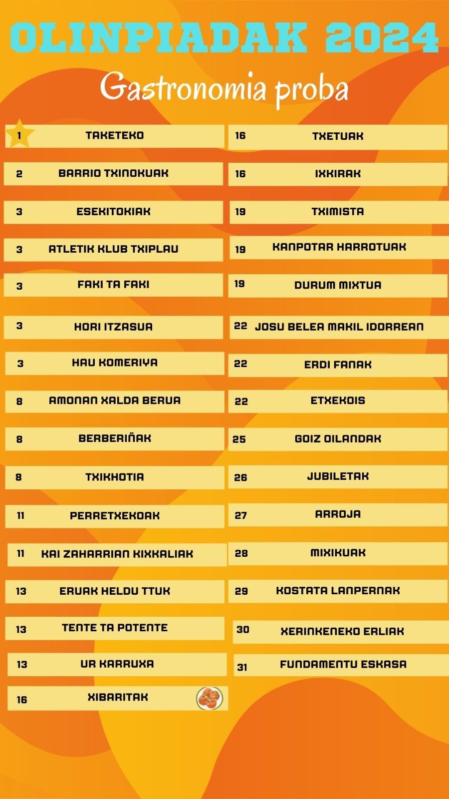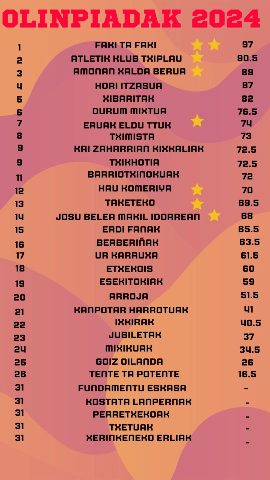 Hasieran 31 talde ziren arren hogeita seik amaitu dute 2023-2024 denboraldia. Puntuaketarik ez duten taldeek 2 strike jaso zituzten. Hau da, probaren batera edo bileraren batera ez joateagatik strike bat jartzen zuten. Bi jasotzerakoan lehiatik kanpo geratu dira Fundamentu eskasa, Kostata lanpernak, Perretxekoak, Txetuak eta Xerinkeneko erleak taldeak.