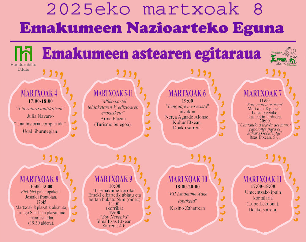 Martxoaren 4tik 11ra bitarte hamaika jarduera antolatu dituzte. Literatura lantzen; V. Martxoak 8 lehiaketako kartelen erakusketa; Hizkuntza ez sexistari buruzko hitzaldia; Sare morea osatzen; Sahararen aldeko kontzertua; Bixi-bixi pala topaketa; Manifestazioa; II. Emakumeak korrika; Filmak; VII. Emakume Xake topaketa; Eta ipuin kontalaria.