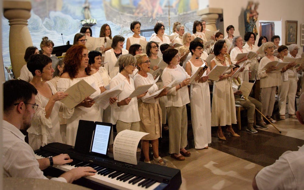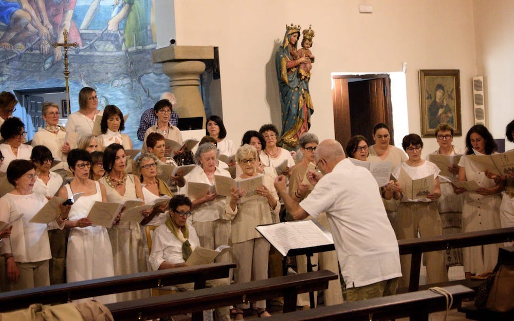 45 abeslari inguru bildu ziren Portuko elizan, egungo abeslariak eta izandakoak. Lehenik, abesbatzako kide direnek bederatzi obra abestu zituzten, eta ondoren, kide izandakoekin beste hiru obra eskaini zituzten, Amaia Aldalurren zuzendaritzapean eta Iñaki Gezala pianistaren laguntzarekin.