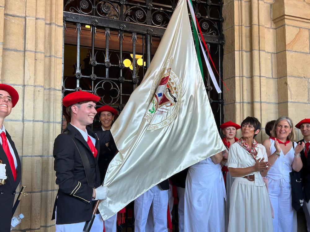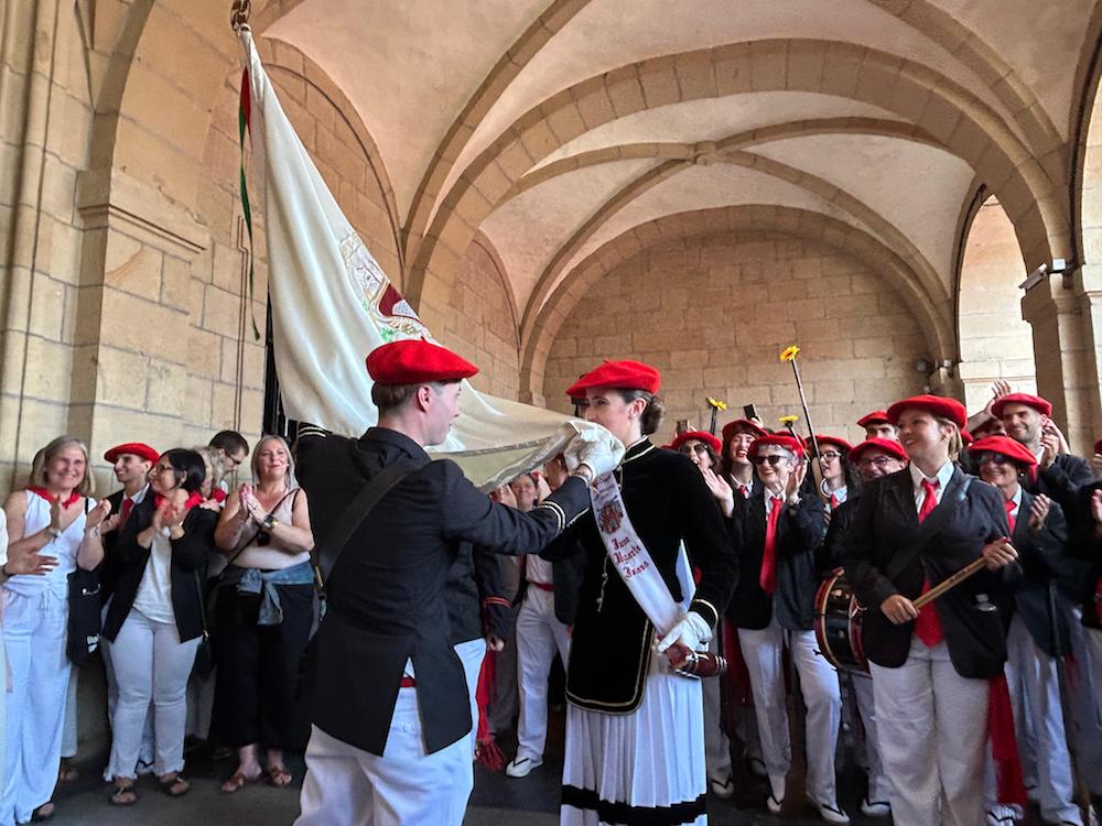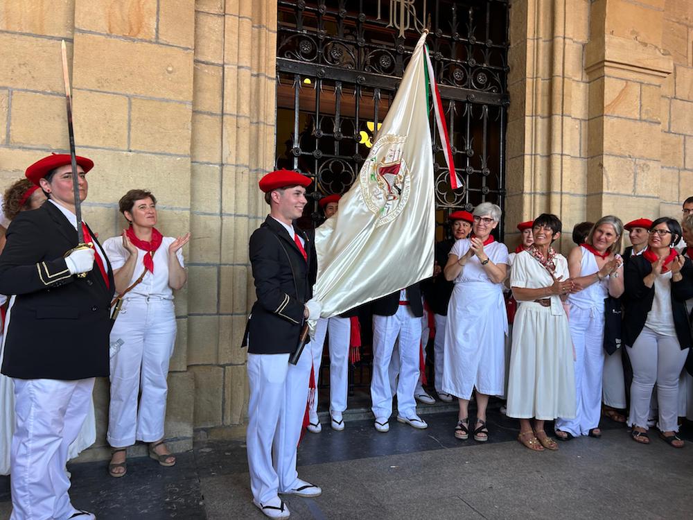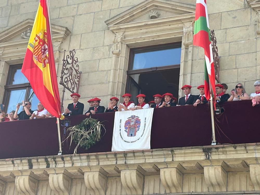 Harreraren ondoren, EH Bilduko zinegotzi Ane Unanuek eman dio hiriko bandera Bidasoa konpainiako abanderatuari, Iker Monterori. Une hunkigarria udaletxeko arkupetan. Bidasoko kantinerak, June Ugartek, musukatu du ikurra. Harro, pozik, hunkituta. “Gora Bidasoa! Gora Irun! Gora San Martzial! Gora Irungo Alardea!”, oihukatu du Monterok jada bandera eskuan. Irungo Alardeak publikoa eta bakarra izan behar duela aldarrikatu du horrela. Balkoian zeudenetako asko ziren udaletxearen behealdean bandera emateko unean. Cristina Laborda alkatea, ez.