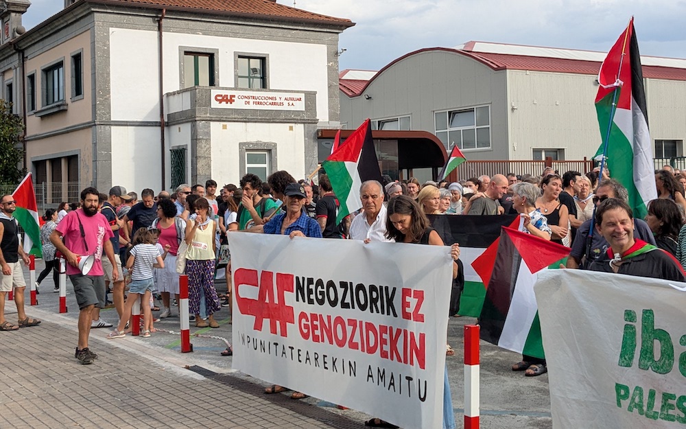 Argazkia: Urko Iridoy Israel hiltzaile, CAF laguntzaile!. Besteak beste, lelo horrekin egin du bidea 17:00etan San Juan plazatik abiatu den manifestazioak. CAF enpresa izan da helmuga, Ibaitik itsasora ekimenak Israelekin harremanak dituzten erakundeak salatu nahi izan ditu eta. Jerusalemgo tren arina gauzatzen ari da CAF, eta 20 urteko hitzarmena sinatu dute.