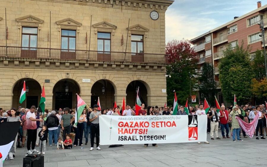 Palestinako banderak airean eta 'kufiyak' soinean ozen oihukatu zuten udaletxe parean bildu ziren zientoka herritarrek. "Gora Palestina erresistentzia" edota "Israel hiltzaile Europa laguntzaile" bezalako aldarriak egin zituzten.