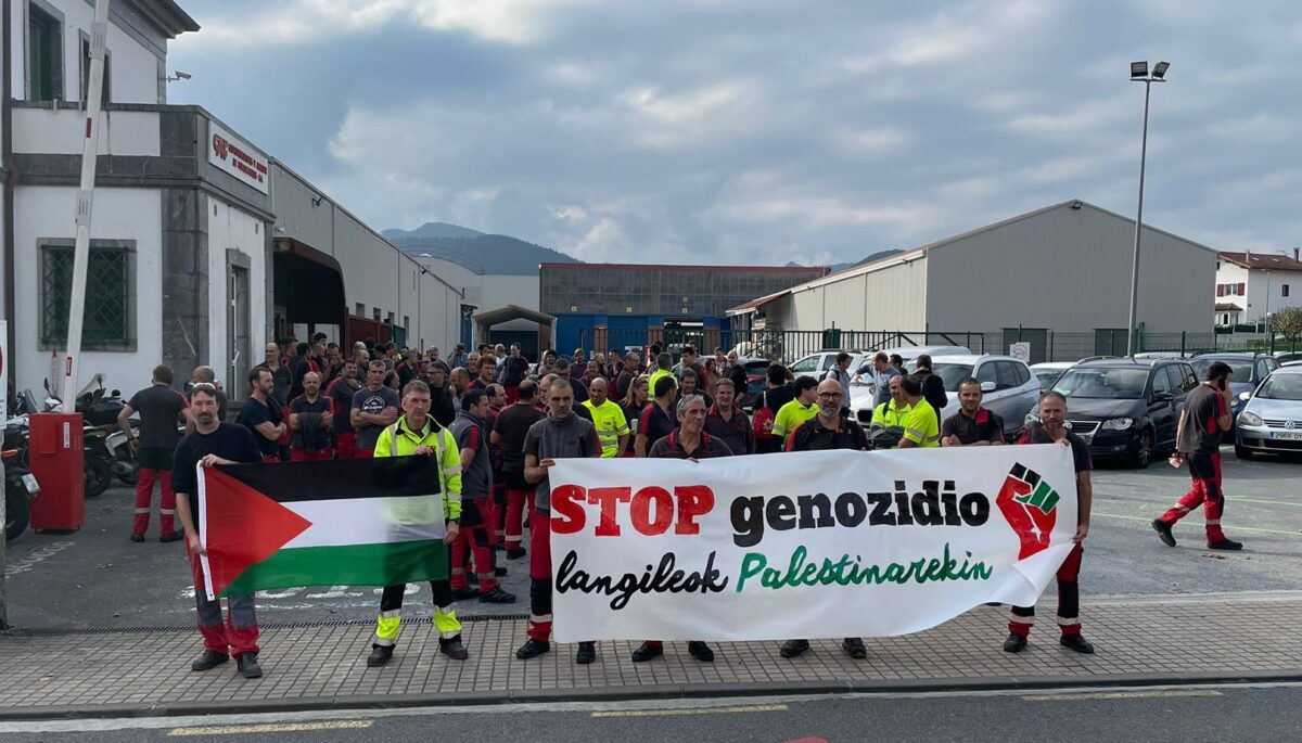 Irungo CAF lantegiko langileen protesta gaur goizean Palestinaren alde. Lantegiak eta ikasgelak hutsik gelditu dira gaur. Mundu bat irten da kalera Palestinari elkartasuna adierazi eta genozidioarekin negozioa egiten ari diren enpresa eta erakundeei Israelekin harreman oro eten ditzaten eskatzeko. LAB, CCOO, UGT, ESK, Steilas, CGT/LKN, Solidari, Etxalde eta Hiruk hiru orduko lanuzteak dituzte deituta gaueko, goizeko eta arratsaldeko txandetan eta greba orokorra hezkuntzan.
