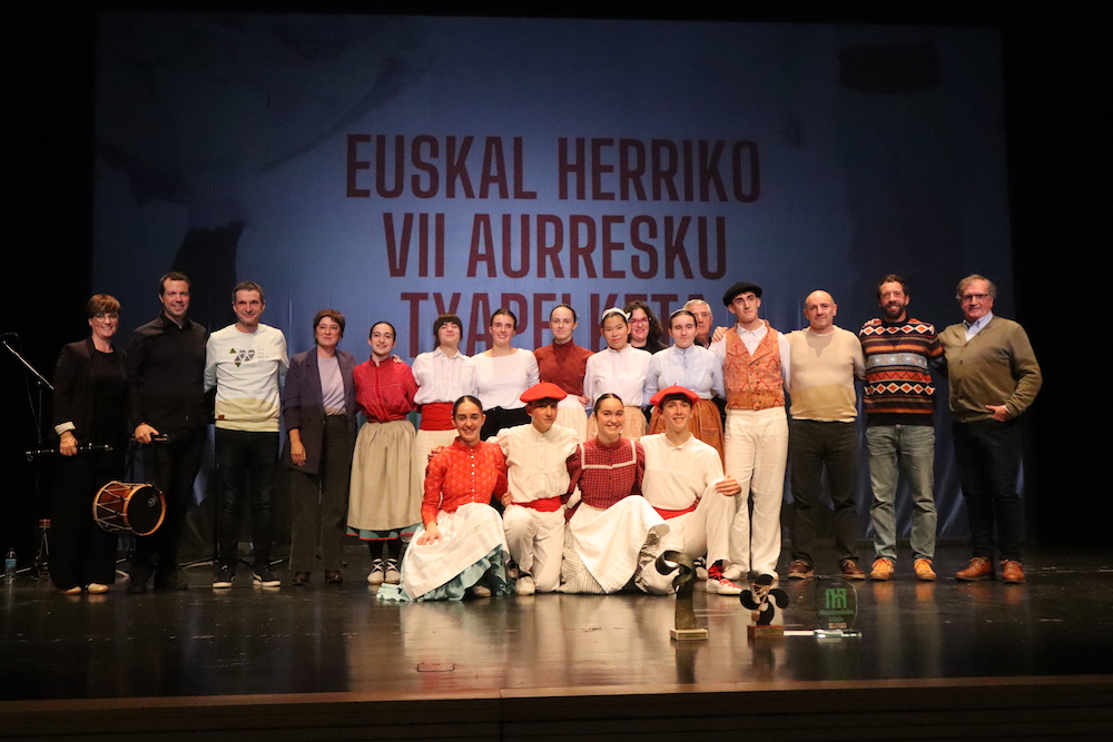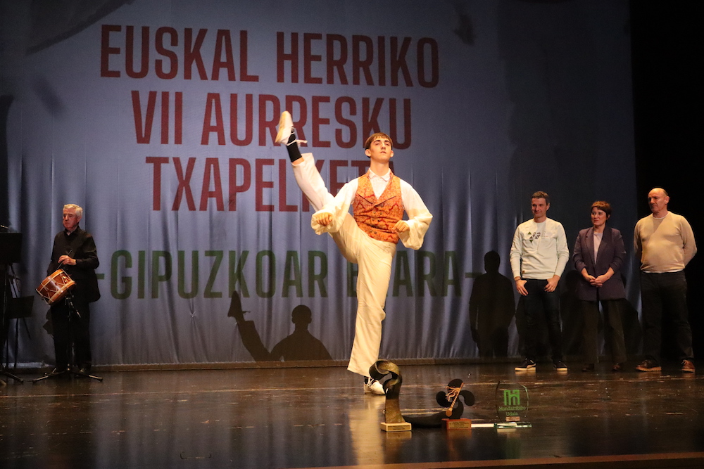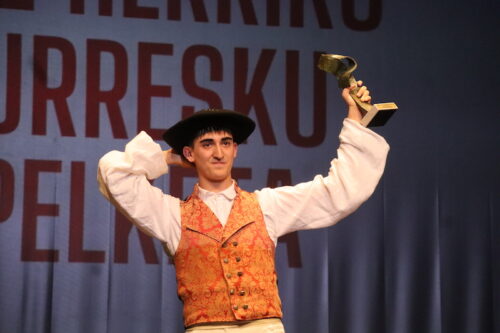 Mikel Esnaola, txapela eta trofeoa eskuan. Argazkia: Gipuzkoako Euskal Dantzarien Biltzarra.