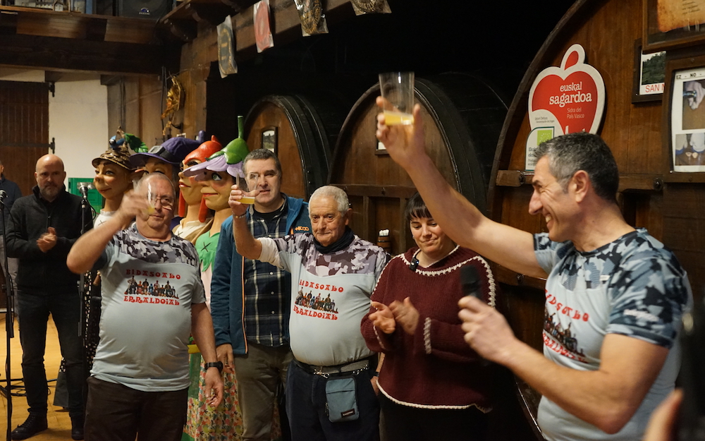 Bidasoako Erraldoietako hiru kide, Eider Bengoetxearekin batera. Ttxotx! entzun da Meakan. Ireki dira Ola sagardotegiko kupelak, eta husten hasi dira. Sagardo berria estreinatu zuten atzo Olan, 2026ko txotx irekieran. 240 pertsona elkartu ziren Meaka auzoko sagardotegian, urtero moduan, sagardotegi denboraldiari hasiera emateko, eta giro ederra sortzeko. “Batzuk mikatzagoak, besteak gozoagoak, baina nire ustez, denak onak”, esan zuen bertaratutako batek. Denboraldi luzea dute aurretik, lan kargaz betea.