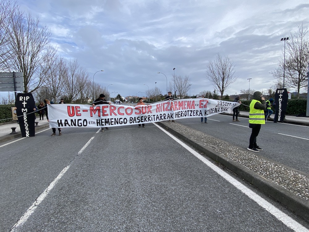 Ekintzaren une bat.Baserritar Bilgunea Baserritar Bilguneak ekintza egin zuen atzo Irungo Santiago zubian, Gipuzkoa eta Lapurdi arteko lotunea moztu zuten, hainbat kide kateatu egin ziren zubian. Europako Batasunak (EB) eta Mercosurrek iragarri berri duten akordioaren kontrakoa izan zen ekintza: “EB-Mercosur ituna korporazio agroindustrial handien mesederako artefaktu berri bat da, Atlantikoaren bi aldeetan tokiko, bidezko eta lurraldearekiko errespetuzko elikadura ekoizpena daramagun baserritarrak sakrifikatzen dituena”. Itunari ezezko irmoa adierazi zioten ekintzarekin, “ezezko kontziente eta beharrezkoa”.
