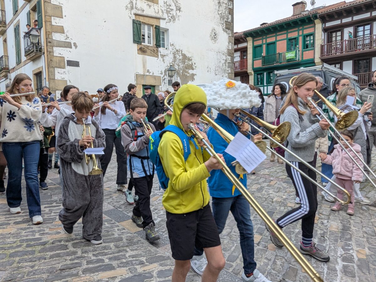 Tronpetak, saxofoiak, tronboiak… instrumentu mordoa eta ikasle mordoa. Denetariko mozorroak ikusi dira, hala nola animaliak, estralurtarrak, esploratzaileak eta ehiztariak. Musika Eskolatik abiatu dira, Ikusi mendizaleak jotzen, eta Alde Zaharretako kale estuetatik jarraitu dute.