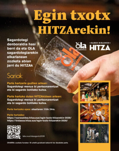 Sagardotegiak (250 lagunetzako jangelarekin), Txotx garaian urtarrilaren erdialdetik maiatza bukaera arte zabaltzen ditu bere ateak, asteartetik igandera afariak emanez eta larunbat, igande eta jai egunetan bazkariak ere emanez, astelehena atseden eguna izanik.