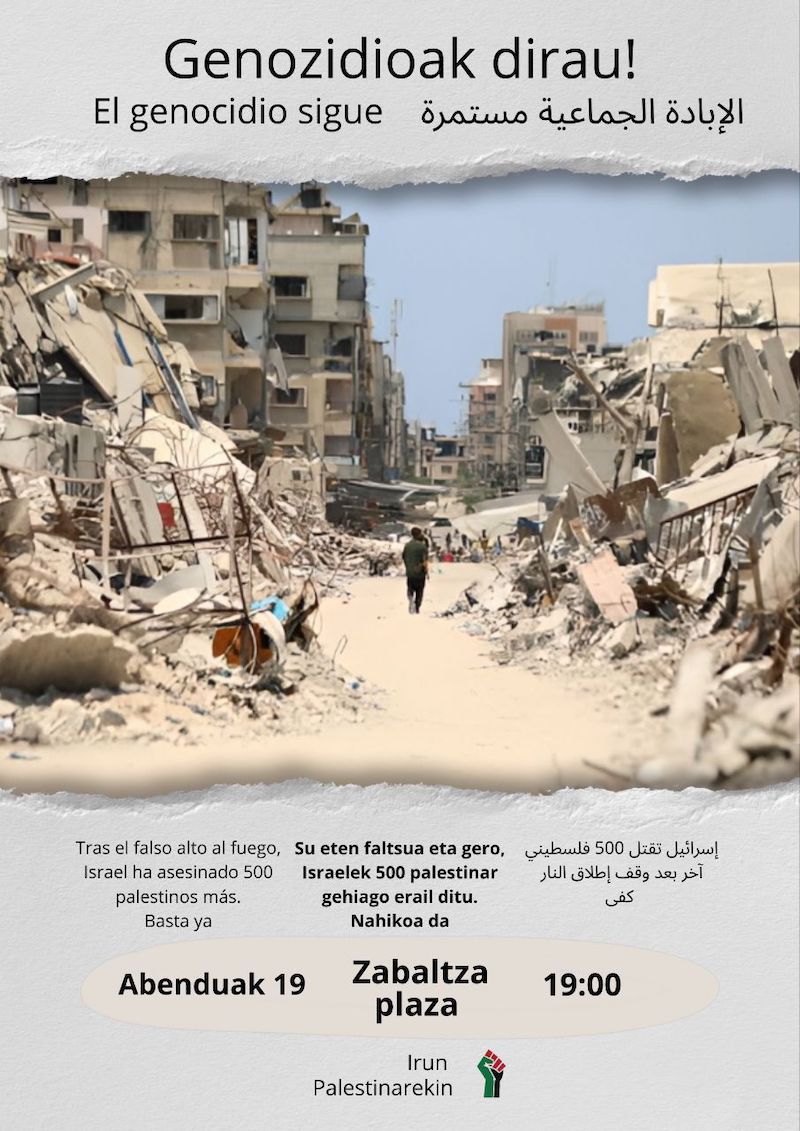 Irun Palestinarekin taldeak mobilizazioa egingo du Zabaltza plazan, 19:00etan.