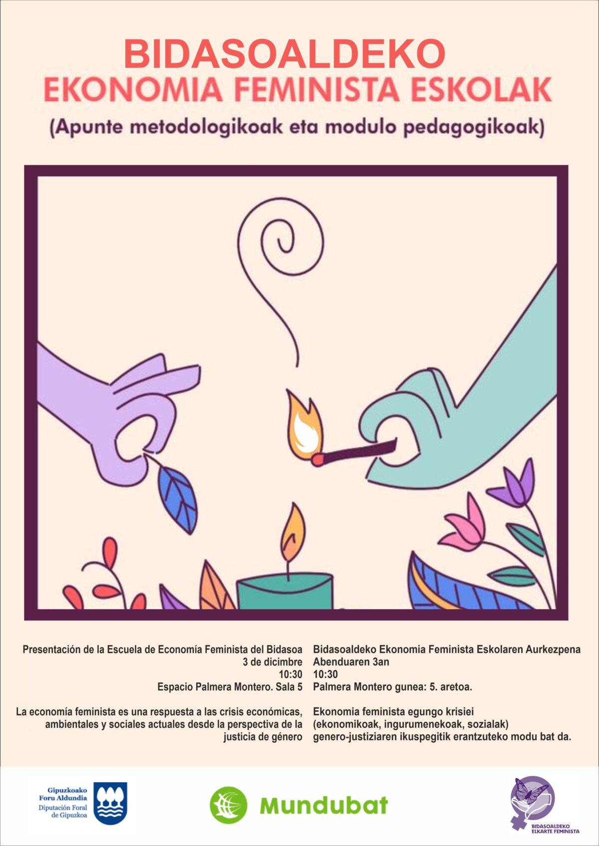 Ekonomia Feministaren Eskolaren aurkezpena egingo dute abenduaren 3an, Palmera Monteron, 10:30ean. Bidasoaldeko elkarteak “asko maite duen” proiektua dela gogoratu dute eta berrartu egingo dute, hau da, ez da eskola berria. Donostiako Emakumeen Etxean ezagutu zuten Ekonomia Feminista Eskola, 2016an, eta urte horretan bertan Irunera ekartzea erabaki zuten.