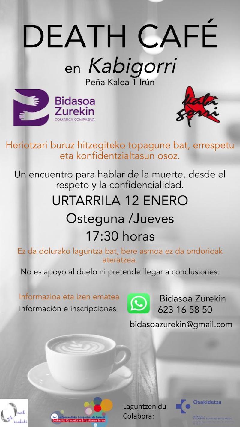 Heriotzari buruz hitz egiteko topagune bat antolatu dute urtarrilaren 12an, 17:30ean, Kabigorri Ateneoan. Death Cafe izeneko saioa Bidasoa Zurekin Comarca Compasiva elkarteak gidatuko du. Antolatzaileek argi utzi dute errespetu eta konfidentzialtasun osoz mintzatuko direla, eta ez dela dolurako laguntza bat, bere asmoa ez da ondorioak ateratzea.