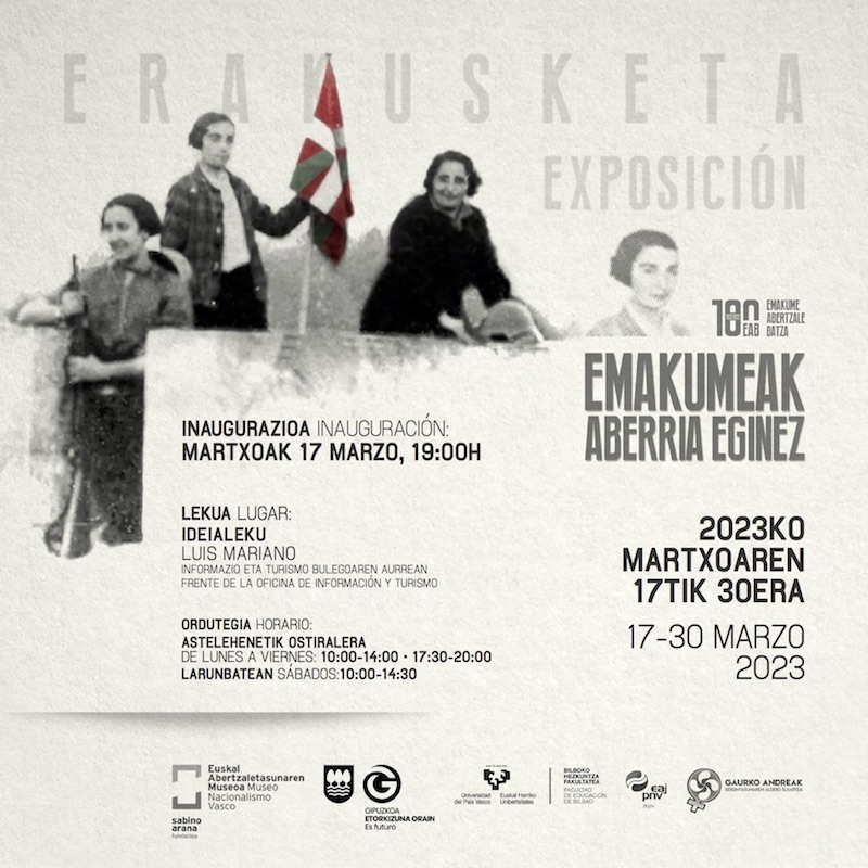‘EABko emakumeak, abertzaletasun ametsen eroale’ hitzaldia antolatu dute martxoaren 23rako, 19:00etan, IDEIAlekun. Erakusketaren komisario eta EHUko irakasle diren Karmele Perez Urraza, Begoña Bilbao Bilbao eta Gurutze Ezkurdia Arteaga izango dira hizlariak.