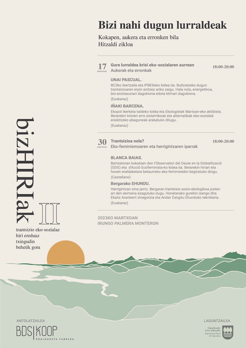 BDSKoop-ek ‘bizHIRIak’ foroa antolatu Bidasoa Behea eskualdean trantsizio ekosoziala bultzatzeko helburuarekin. ‘Bizi nahi dugun lurraldeak’ lelopean, bi hitzaldi antolatu dituzte. Lehena martxoaren 17an izango da, Palmera Monteron, 18:00etan, euskaraz. ‘Gure lurraldeak krisi ekosozialaren aurrean. Aukerak eta erronkak’ da lehen saioan landuko duten gaia. Unai Pascual eta Iñaki Barcena izango dira hizlariak.