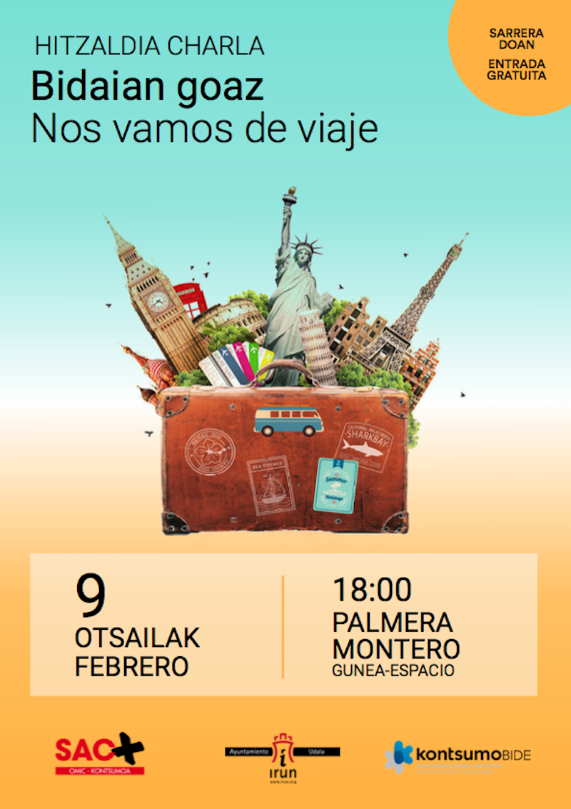 Kontsumitzaileak Informatzeko Irungo Udal Bulegoak eta Kontsumobidek bidaien antolaketari buruzko hitzaldi bat emango dute datorren otsailaren 9an, 18:00etan, Palmera Monteron.