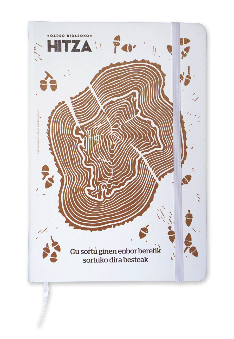 Allende Arnaiz sortzaile oiartzuarrak diseinatutako ‘Gu sortu ginen enbor beretik sortuko dira besteak’ A5 tamainako koadernoa. 192 orrialde zuri, ixteko gomarekin eta orri-markatzailearekin.
