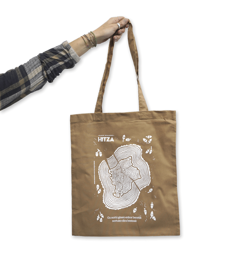 Allende Arnaiz sortzaile oiartzuarrak diseinatutako ‘Gu sortu ginen enbor beretik sortuko dira besteak’ 40,5 x 36 cm Caramel koloreko tote poltsa.